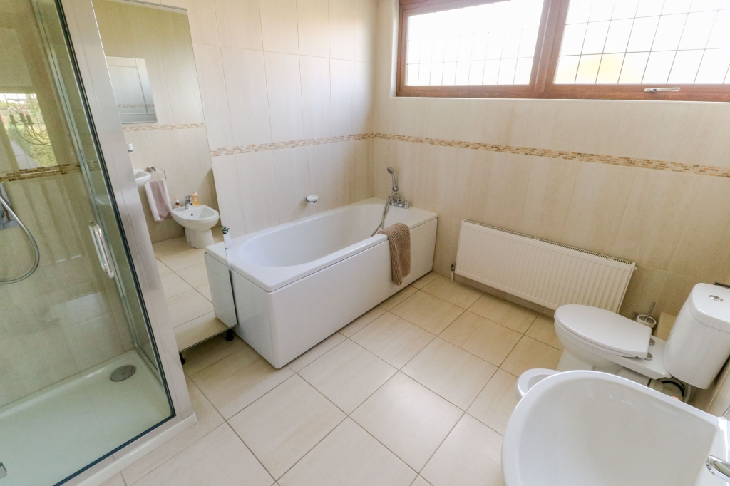 FAMILY BATHROOM 10’2 x 8’9 High level obscure glazed window to front. Tiled in matching wall and floor ceramics with detailed tiled border. Radiator and fitted with a suite comprising panelled bath with mixer tap and shower attachment, walk in shower cubical with glazed wall and door, drench shower and additional handheld shower. pedestal wash hand basin, bidet and low flush W.C.