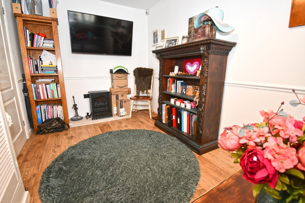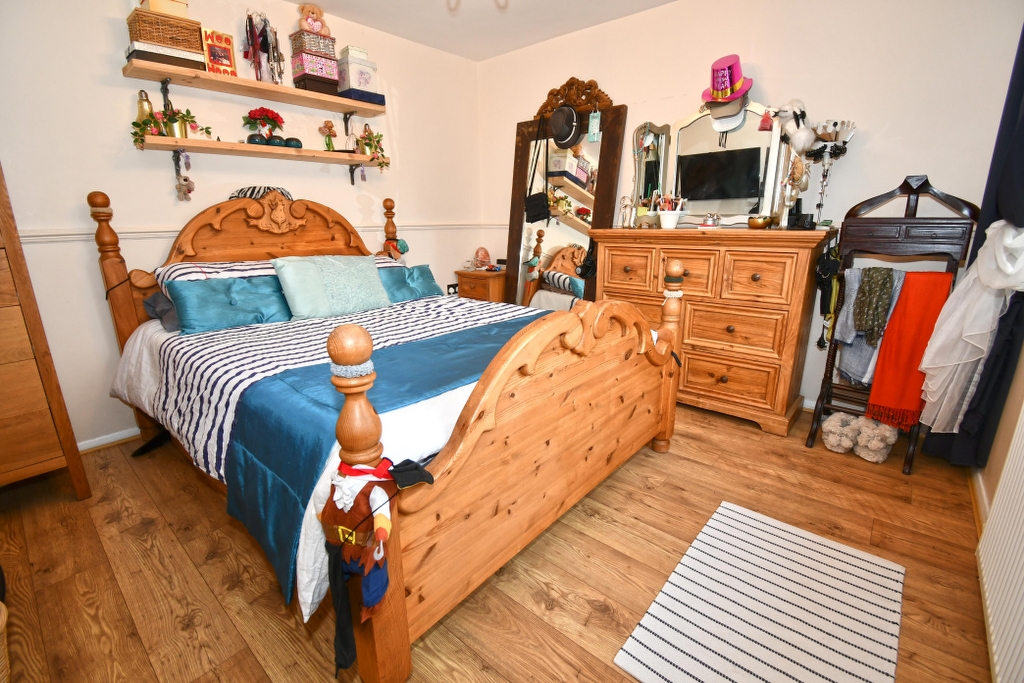 SECOND BEDROOM 11’4 x 10’10 Leaded light window to front, wood effect flooring. Radiator dado rail, TV and media points. Open shelving.