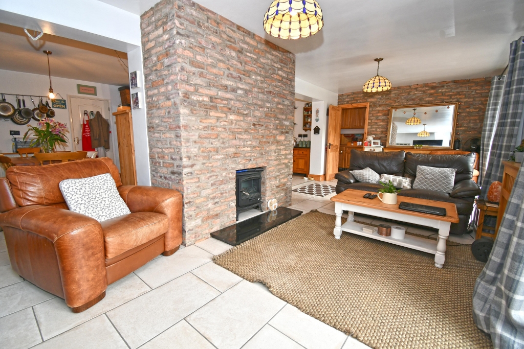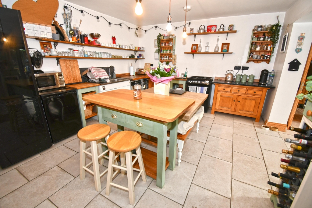 KITCHEN/BREAKFAST ROOM 24’8 x 13’4 Fitted with bespoke base units, with a mixture of wooden and granite working surfaces over. Stainless steel, single drainer, sink unit with mixer tap and cupboards below. Spaces for oven, fridge and freezer. Ample open shelf storage. Italian stone flooring. Radiator with pine shelf above. Feature fireplace with electric fire marble surround, matching hearth and mantel with two openings either side leading to the: