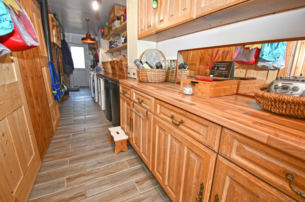 DINING ROOM 17’4 x 7’10 Leaded light window to front, wood effect flooring and dado rail. Cupboard to one wall with four louvered doors also housing the gas and electricity meters with further storage shelving below. Radiator.